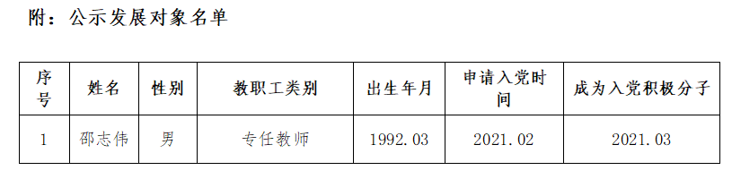根据《beat365唯一官方网站发展党员公示办法》规定,经beat365唯一官方网站教工党支部委员会审查,拟发展邵志伟同志为发展对象,现将有关情况公示如下,征求党员和群众的意见,并就有关事项公告如下:
