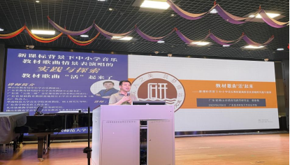 此次讲座曾春燕老师结合佛山教研基地的实践经验,从背景与初衷、理念与实施、成效与启示、学校美育工作的思考四个方面进行讲述。曾老师首先和大家解读新课标的核心内容,提出应加强教师研究教材歌曲意识,增强教师的创意演绎能力等,分享了佛山市中小学教师教材歌曲情景表演唱展演活动的成果。针对“如何让新课标理念转化为教学实践,如何落实新课标要求”,曾春燕老师提出:开展教、学、评一体化教研,坚持育人导向,积极推进音乐课堂情景教学模式的研究与实践。