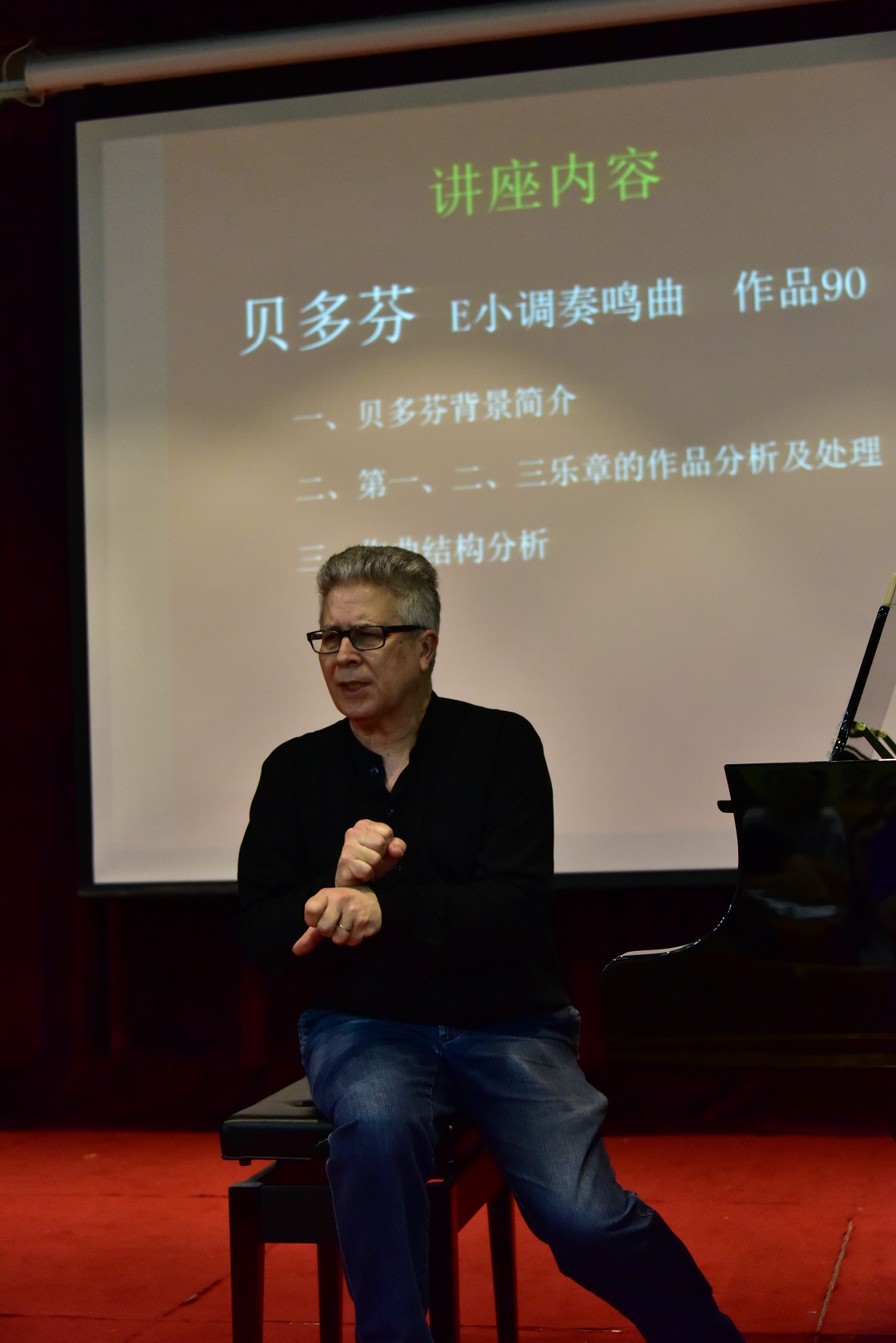 12日下午15:00时,讲学活动在第二教学楼讲学厅602室举行,阿伦.维斯教授以贝多芬E小调奏鸣曲作品第90号和贝多芬A大调奏鸣曲作品第101号为例介绍贝多芬中晚期钢琴作品的转型和作品处理。阿伦.维斯先生在同行中被称为对“钢琴风格有深刻的理解及超凡的想象力和表现力”的名家,在将近两个小时的讲学中,现场气氛活跃,在提问环节中同学们踊跃上台演奏,阿伦.维斯先生给予现场指导,并详细点评,热情奔放和幽默的演讲赢得师生们的阵阵掌声,同学们也表示听了阿伦.维斯教授的讲座受益匪浅。