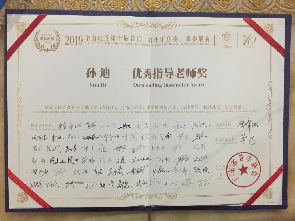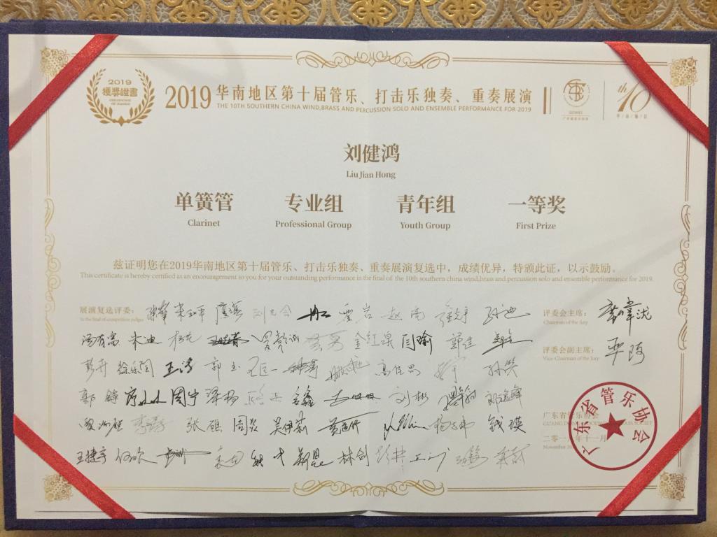 2019年11月16日至17日,华南地区第十届管乐、打击乐独奏、重奏展演在广州白云国际会议中心盛大举行。本届展演的突出特点是专业性,这也是华南地区历届管乐、打击乐独奏、重奏展演一直坚持的传统。我院学子16级音师班刘健鸿、18级音师班张凯镅在孙迪老师的精心指导下,演奏作品水平得到稳步提升,特别是在作品风格的把握和演奏技术运用上,两位同学都发挥出色,展示了风采,从初赛到复赛过关斩将,最终刘健鸿演奏的作品《莫扎特A大调协奏曲》斩获专业青年组一等奖,张凯镅演奏的《霍夫麦斯特协奏曲》获得非专业青年组一等奖。为学院赢得了荣誉。