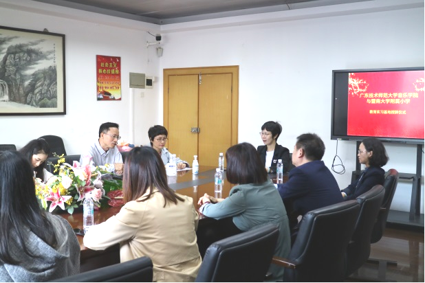 会上,黄书记表示非常感谢暨大附小给予我院学生实习的平台与机会,黄书记表示,暨大附小良好的师德师风,老师们认真负责的态度,深深教育影响了我们的实习生,让学生体悟如何做一位“四有”的好老师。同时,黄书记也向大家介绍了的广师大发展和师资队伍建设情况,并期望以此次实习基地挂牌仪式为新的起点,推动双方在人才培养、艺术学科研究、校园文化建设等方面深度合作。