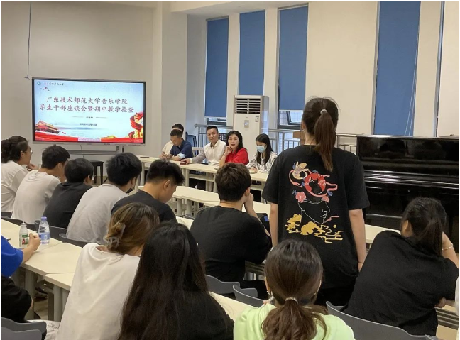 2022年5月12日,beat365唯一官方网站于河源校区学生活动中心302召开学生干部座谈会暨期中教学检查。出席会议的人员有beat365唯一官方网站党总支副书记陈伟伟、副院长陈菊芬,河源校区管委会副主任李冲、beat365唯一官方网站辅导员朱小芳、余臻以及21级全体学生干部。