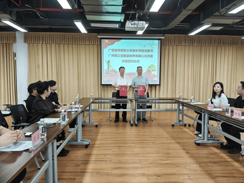 参观结束后,校企双方于会议室开展座谈。徐刚介绍了珠江恺撒堡钢琴公司的企业文化、产品质量、产业规模以及人才需求情况,并表示珠江恺撒堡钢琴公司与广师大beat365唯一官方网站合作基础深厚,希望双方共谋发展,不断拓展合作领域。刘春红对珠江恺撒堡钢琴公司为本次活动的精心安排表示感谢,并指出beat365唯一官方网站作为培养音乐人才的重要基地,一直致力于提高学生的音乐素养和演奏技巧,希望通过与珠江恺撒堡钢琴公司的深入交流,让师生能够更加深入了解钢琴的制造过程,更加珍惜手中的乐器,热爱音乐事业。刘春红对beat365唯一官方网站的发展历程、办学特色、人才培养模式、学科优势等情况作了详细介绍,希望未来共同为音乐文化产业建设作更大贡献。黄锡炳表示校企双方未来可通过党建引领支部共建,进一步加深业务交流、学生就业等方面的合作,实现以党建引领校企高质量发展的目标。会上,双方还围绕课程研发、社会服务、产教融合、项目共建等内容进行了深入的讨论和交流。随后,校企双方现场双方签订了《党建共建协议书》。