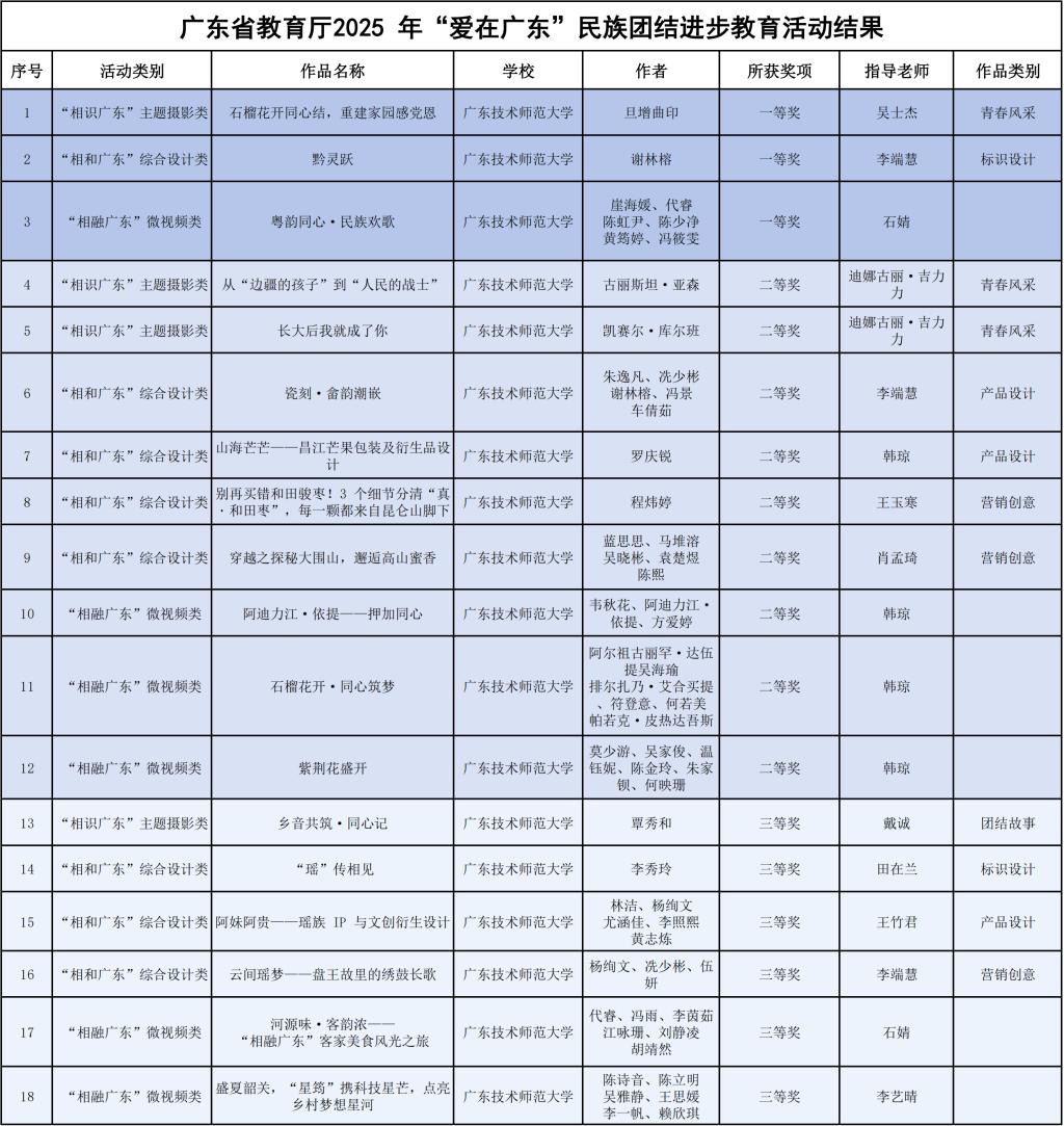 近日,广东省教育厅公布2025年“爱在广东”学校民族团结进步教育活动评选结果,beat365官网成绩斐然,beat365唯一官方网站师生积极参与、精心筹备,充分展现了学院美育育人与民族团结进步教育融合的丰硕成果。