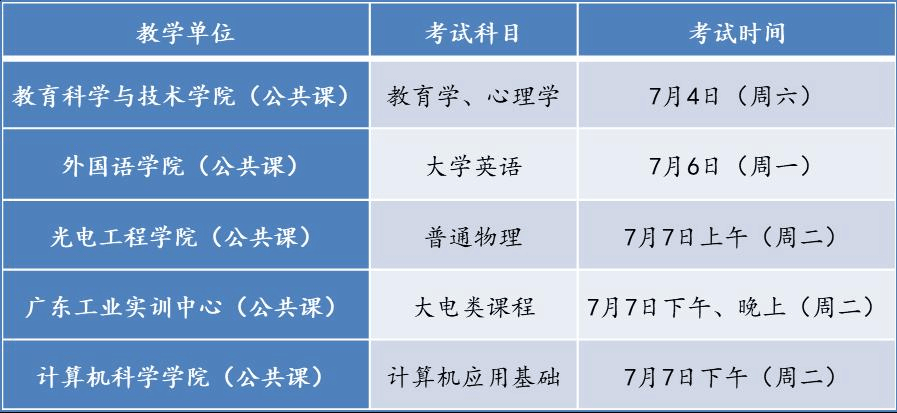 1. 为避免考试时间冲突,学校承担公共基础课的教学单位(体育部、数学与系统科学学院、马克思主义学学院除外),定于7月4日(周六)至7月7日(周二)进行课程集中考核。具体考核时间安排如下: